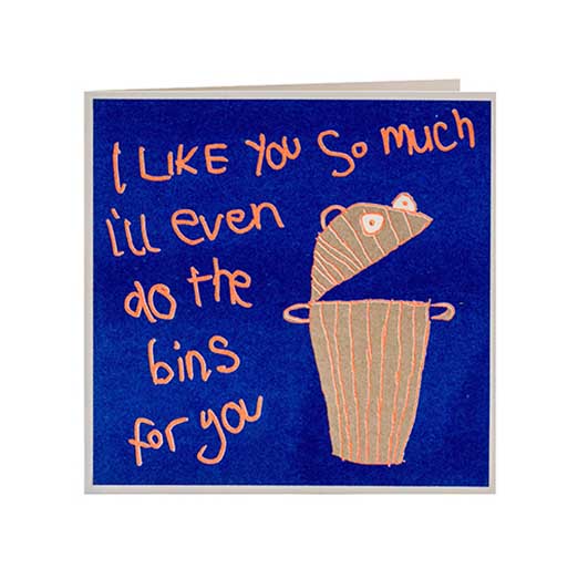 Would you do anything for love? This funny yet tender card says that Love Is…taking the bins out! Created by ARTHOUSE Unlimited artists Phillipa Morrison & Chris Hodding, it is blank inside & ready for your own personal message.