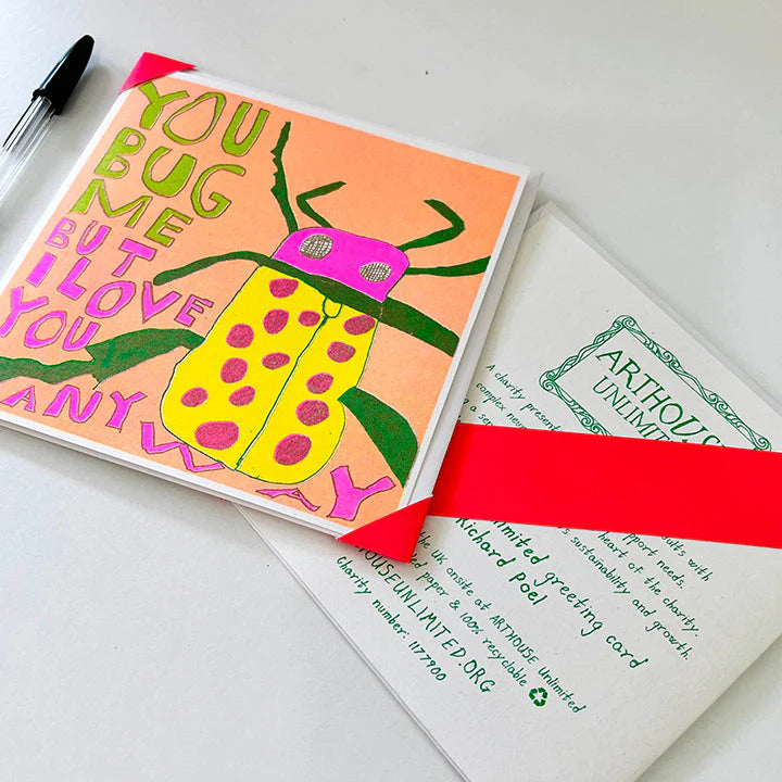 No one’s perfect so tell it like it is with this colourful, candid card designed by ARTHOUSE Unlimited artist Richard Poel. Blank inside, this love bug is ready to spread it's wings to the person you most love.
