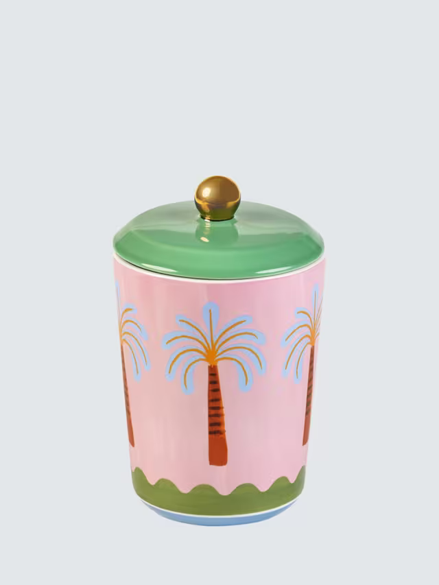 Known for her quirky, colourful and fun designs, British designer Eleanor Bowmer has created the Electric Coast range, inspired by the golden coastlines of Los Angeles. This jar features Eleanor's hand-illustrated Palm Tree design and is finished with a gold-toned handle