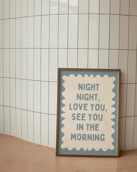 Night Night, Love You | Dusty Blue and Cream | Wall Art Print A3 Black Frame