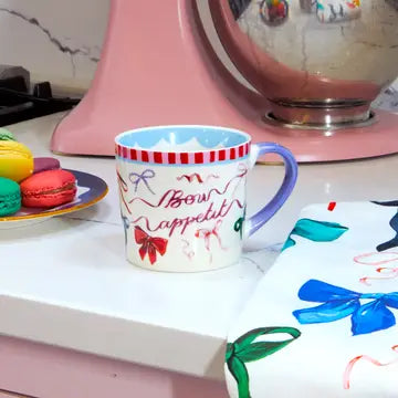 The contrasting pink and red stripes, blue scalloped detail on the inside, and lilac handle add a colourful touch to your favourite hot beverage.