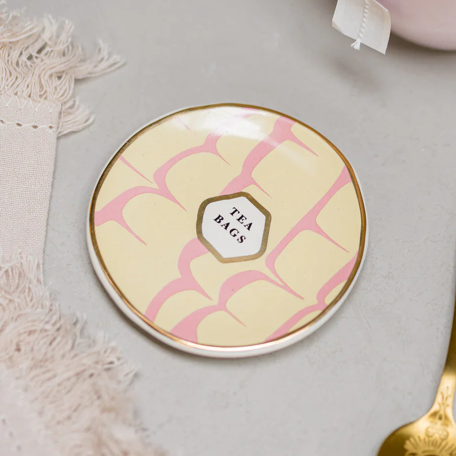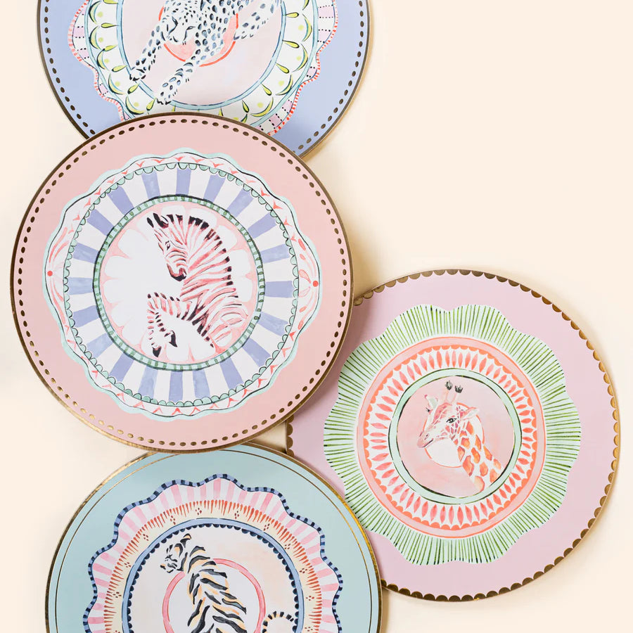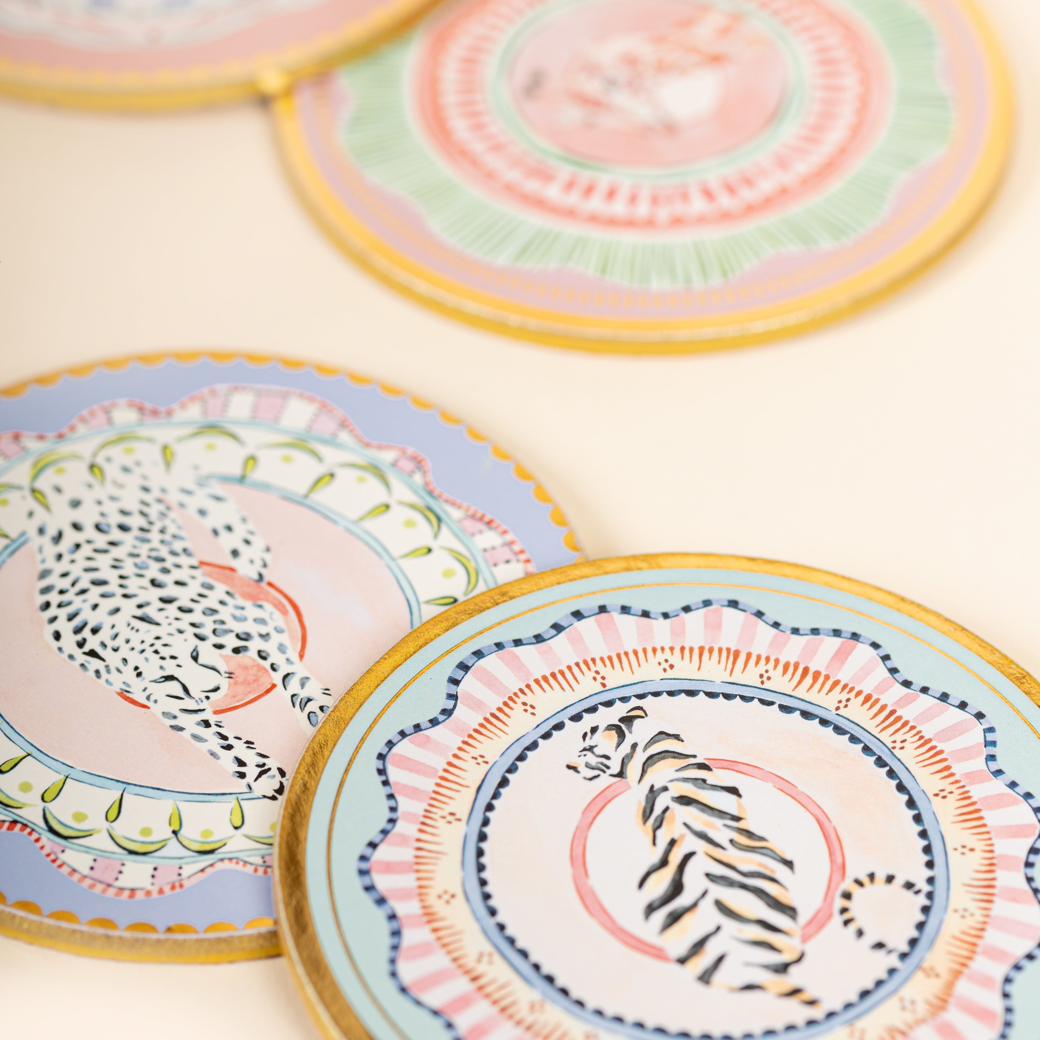 Two candlestick holders with a cat design, one in pink and one in green, with gold detailing, on a white surface.