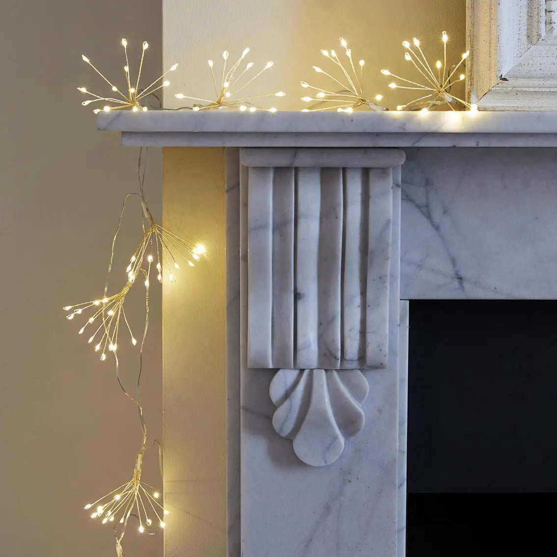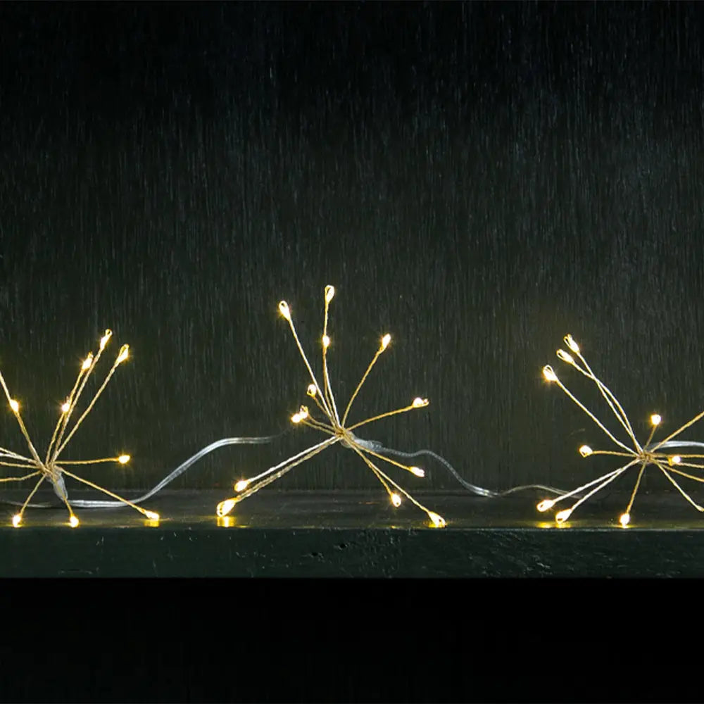 Open out each cluster of LED lights and twist and shape into a starburst shape. A warming winter or Christmas decoration for your home, these battery-powered string lights will illuminate a Christmas table with a warm glow or add a lift to your Christmas décor wrapped around a banister, bedframe or bookcase.