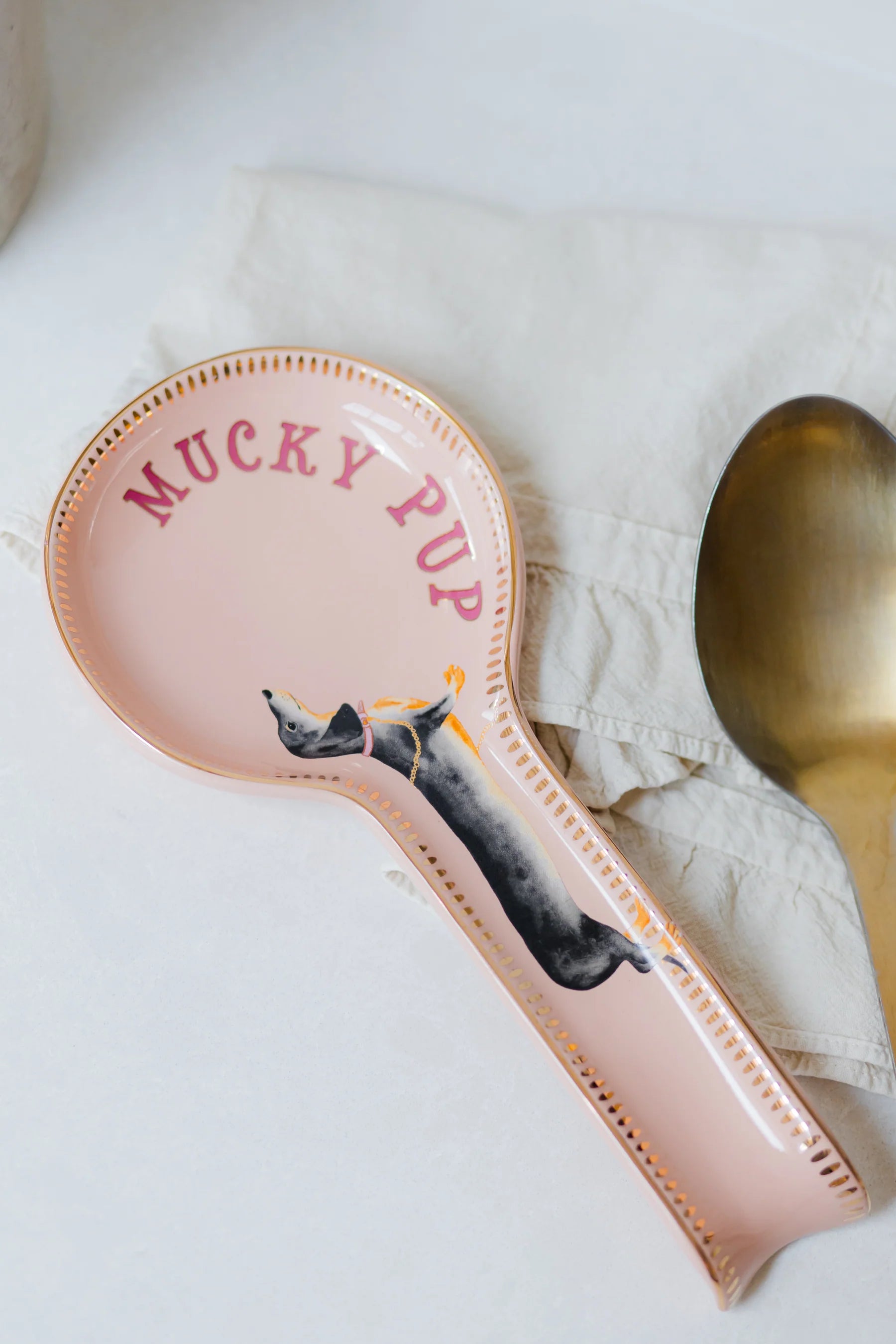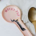 How adorable is this doggie spoon rest?! A 'mucky pup' slogan with my cute sausage doggie illustration and gold detailing, the perfect iconic Yvonne Ellen mix, a charming touch to any countertop!