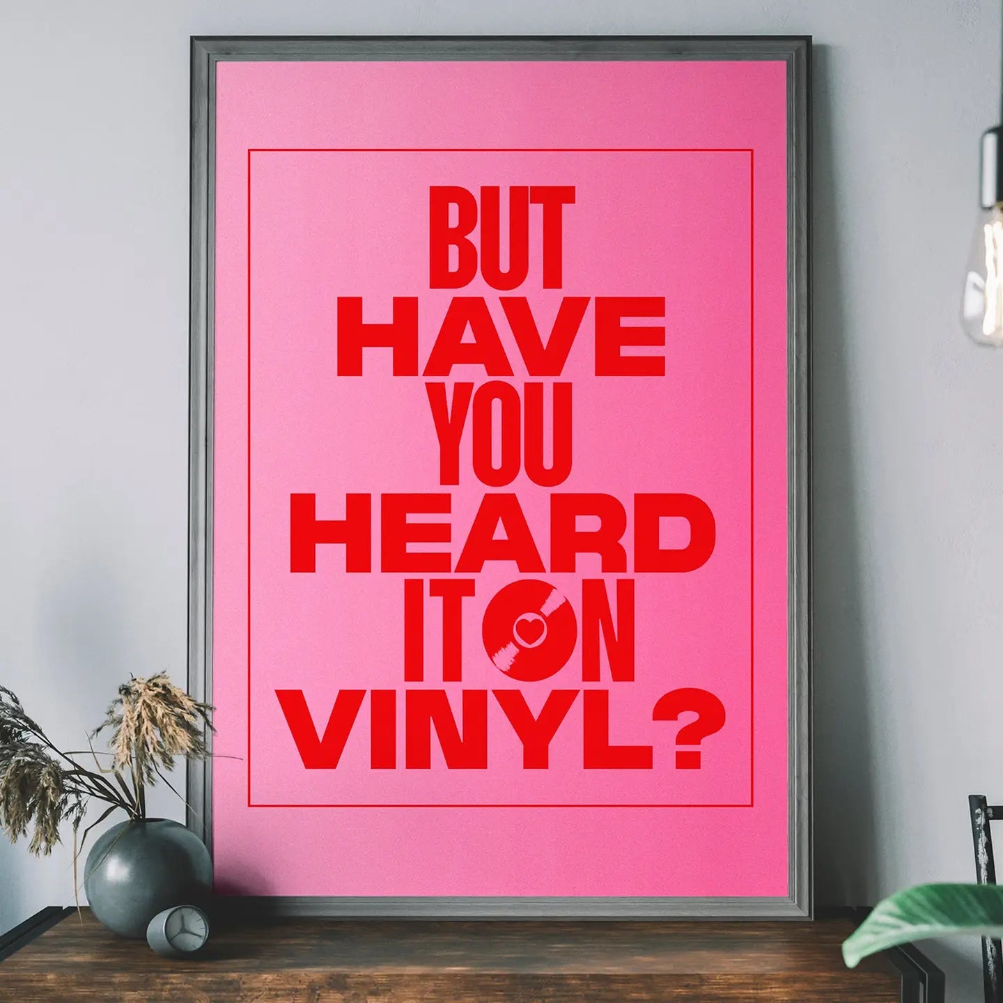 Our Famous Slogan print, now set in beautiful bright pink and red lettering. Super on-trend typography poster to declare your love of Vinyl! over the top, this high-quality matte print brings a cheeky twist to the classic phrase.
